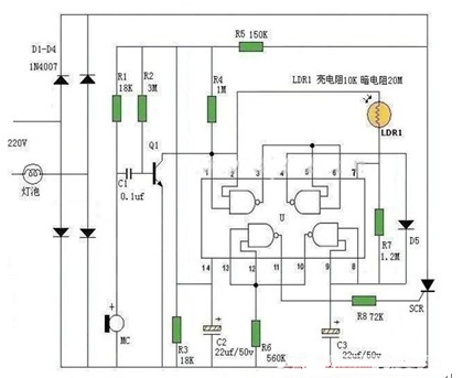 本问所介绍的电路采用MC14011型四与非门完成自动控制照明S:PCR606JMC;驻极体话筒;等声控灯一般由话筒、音频放大器、选频电路、倍压整流电路、鉴幅电路、恒压源电路、延时开启电路、可控延时开关电路、可控硅电路组成。以下是一款颇具创意的声控灯电路图。