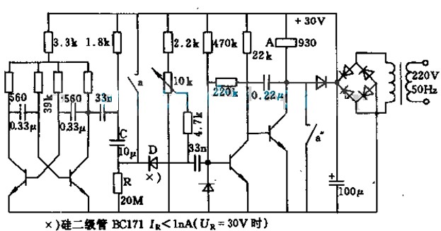 本文介绍的是一款延迟吸合控制电路图。如下图所示,在接通后,时间流程开始电容C首先放电而后通过20M 从点电阻充电。