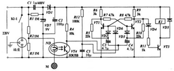 如下图所示,该电路全部采用分立元件构成,其中,用VT1、VT2接成了一个“计数式双稳触发器”电路,其翻转与否受VT4集电极输出端电位的控制。电路的触摸控制采用了由微型氖灯泡ND照射光敏(VT4)的光电隔离控制方式。VT3用于输出驱动控制信号。电路初始加电的瞬间,由于C5经R12的充电作用,在VT1的基极产生一个负脉冲,使VT1截止,相当于触发器被置“0”,此时,VT2导通,其集电极输出为低电位,VT3截止,K1不吸合,K1-1接点处于断开状态,插座中的用电器不工作,电路处于静止状态。当触摸电极M时,ND起辉发光(与试电笔的原理相同),照射与其对顶在一起的VT3,由于光敏三极管具有较高光控的灵敏度,ND发出的微弱辉光即可使其导通,集电极变为低电位,使由VT1、VT2组成的触发器的计数输入端产生一个负的跳变,触发器被触发翻转置“1”,即VT1导通,VT2截止,VT2的集电极变为高电位,这使VT3导通,继电器K1吸合,K1-1接点闭合,插座中的用电器得电工作,电路完成触摸“开”的功能。同理,再次触摸电极M时,计数式触发器将再被触发翻转置“0”,即VT1截止,VT2导通,VT3恢复截止,继电器K1释放,K1-1接点恢复断开状态,插座中的用电器停止工作,电路完成“关”的功能。这样,每触摸电极M,触发器就会翻转,同时也使输出控制电路的状态改变,即开关动作。再次触摸M时,电路将自动重复上述工作过程。电路中R2、R3串联后分别接在市电的“火线”和“零线”上,将ND的一端接在R2、R3串联电阻的中间,另一端接触摸电极,这样接线的目的在于实际接线时无须再区别“火线”和“零线”,任意连接均可以确保电路工作正常。