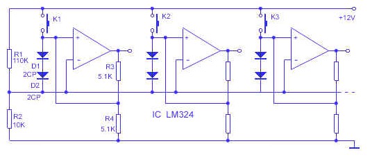 电路中的开关的器件为四运放LM324,经巧妙设计,使每个运放有两重功能,电压比较器和施密特触发器。电压适用范围宽,档位可任意设计,如果加一档空档,可作为总复位,与数字电路配合时,可用同一电源,开关的输入输出电平符合数字电路的接口电平,由于运放的输入阻抗高,开关的输入电流小,可以用轻触开关。导电橡胶。薄膜开关作按键,或光、电、磁等转换信号驱动,可用。。等。