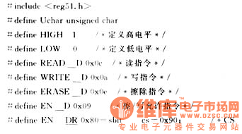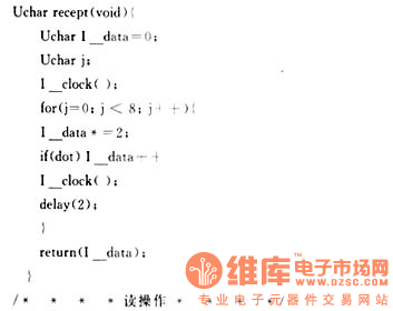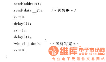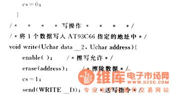 关键词:三线制,串行总线,EEPROM,MCS-51 1三线制Microware串行总线 三线制Microware同步串行总线接口是松下半导体公司在其生产的COP系列和HPC系列微控制器上采用的一种串行总线。它使用的三根信号线是数据输入线SI、数据输出线SO和时钟信号线SK。由于三线制Microware总线只需3~4根数据线和控制线即可扩展具有三线制Microware总线的各种I/O器件,而并行总线扩展方法要8根数据线、8~16根地址线和2~3位控制线,因而使用三线制Microware串行总线可以简化电路设计,提高设计的可靠性。 2具有三线制Microware总线的EEPROM EEPROM是一种可用电气方法在线擦除和再编程的只读存储器,它既有RAM在联机操作中可读可改写的特性,又具有非易失性存储器ROM在掉电后仍然能保持所存储数据的优点。93C06/46/56/66是采用CMOS工艺制成的分别为64/128/256/512×8位,或16/64/128/256×16位8引脚的支持三线制Microware串行总线的EEPROM,其自定时写周期包括自动擦除时间不超过10ms,而MICROCHIP公司的串行EEPROM的擦除和写入一个字节的时间可缩短到2ms以下,擦除/写入周期寿命一般都已达到10万次以上,有的产品(如NS和MICROCHIP的产品)可达到100万次,片内写入的数据保存寿命在40年以上,采用单一电源+5V供电,低功耗工作电流400μA,备用时为25μA,三态输出,与TTL电平兼容。 NM93C06/46/56/66是松下半导体公司的产品,与其兼容的有MICROCHIP公司的93C06/46/56/66(4.5V~5.5V)、93LC/46/56/66(2.0V~6.0V)、93AA06/46/56/66和ATMEL公司的AT93C46/56/66,其封装形式如图1。 ![]() 引脚说明:CS:片选信号;SK:串行时钟输入信号,是微处理器与EEPROM之间通信的同步信号,数据在它的上升沿锁定有效; DI:数据输入; DO:数据输出; ORG:MICROCHIP公司产品特有引脚,接Vcc时内部存储组织结构是16位为一个单元,接GND时内部存储组织结构是8位为一个单元。 芯片有7种指令,指令集的安排见表1。表1 ![]() 注意:在操作码为00时,为了区分不同指令,借用地址的前两位来识别。此外还有整片写指令(WRAL-Write All)和整片擦除指令(ERAL-EraseAll)。 不同型号的EEPROM有不同的存储空间,93C66有512字节的存储空间,其地址为A8…A0,在编程时A8可以作为操作指令字节的最后一位,如:读93C66中某个存储单元(8位)中的数据,读指令0000110A8,地址码××××××××,如果A8为0,则地址00H…FFH,如果A8为1,地址为100H…1FFH。而93C06/46/56的存储空间不超过256个字节,A8始终为0。 有关93C06/46/56/66的具体操作时序见参考文献〔1〕。 3三线制Microware总线EEPROM在MCS┐51单片机上的运用 串行EEPROM技术是一种非易失性存储器技术,它是嵌入式控制解决方案中的先进技术,在MCS-51单片机应用系统中可用于数据的掉电保护、可在线设置参数的存储、用户在线可编程查表法中的表格存储、微控制器I/O线较少情况下的应用等等场合。 MCS-51系列单片机没有三线制Microware串行总线接口,它与93C06/46/56/66等具有三线制Microware串行总线的EEPROM连接时,要使用软件来模拟三线制Microware串行总线的操作,包括串行时钟、数据输入、数据输出。图2为串行EEPROM AT93C66与AT89C51单片机的硬件连接图,R为上拉电阻,AT89C51的P1.0模拟AT93C66的片选端CS,P1.1模拟AT93C66的时钟输入端SK,P1.2模拟它的数据输入端DI,P1.3模拟数据输出端DO(DI和DO也可以连接在一起)。当在时钟的上升沿第一次检测到CS和DI都为高电平时,启动AT93C66。写操作时,AT89C51的P1.1由低变高,产生一个脉冲,在脉冲的上升沿将1位数据(先为高位)从P1.2输出到AT93C66中,清P1.1为0,再置P1.1为1,P1.2又输出1位数据……依次循环8次,AT89C51完成1个字节的输出操作。写入周期完成后,P1.0由高变低,并保持最少100ns后变为高电平,这时93C66的DO线用来表示芯片的状态,DO为1表示数据已写入指定的地址中,为0则表示正在编程,AT89C51可以查询P1.3的状态来决定是否继续操作。读操作时,P1.1由低变高,AT89C51经P1.3从AT93C66读入1位数据,循环8次,读入1个字节。根据操作时序可以写出AT90C51与93C66连接时的操作程序。 ![]() 模拟三线制Mircroware串行总线的操作源程序。根据AT93C66的指令集,规定如下指令格式: 指令格式:00001××A8,其中1为起始位,××为操作码,A8为第9位地址码; 读指令(READ):00001100,即0x0c(如果对93C66的100H…1FFH地址空间操作,则指令最后一位为1,写和擦除指令均如此); 写指令(WRITE):00001010,即0x0a; 擦除指令(ERASE):00001110,即0x0e; 擦/写允许指令(EWEN):0000100110000000,即0x0980,该指令分两次写入; 本程序用C51语言编写(不包括整片写和擦除功能) ![]() ![]() ![]() ![]() ![]() ![]() ![]() ![]() ![]() ![]() | ||